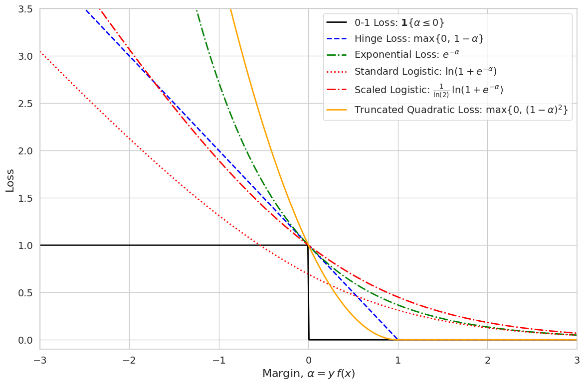 - Surrogate Loss Functions: Surrogates such as hinge, exponential, logistic, and truncated quadratic losses offer smooth and convex approximations that greatly simplify the optimization process. Their forms can be further adjusted, for example by scaling, to ensure they majorize the 0,1 loss.